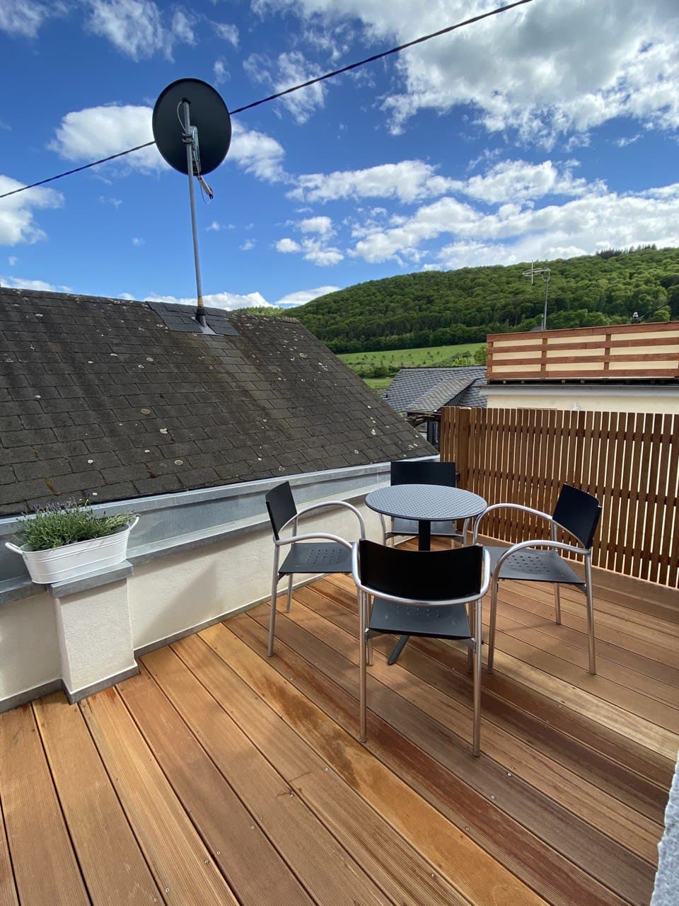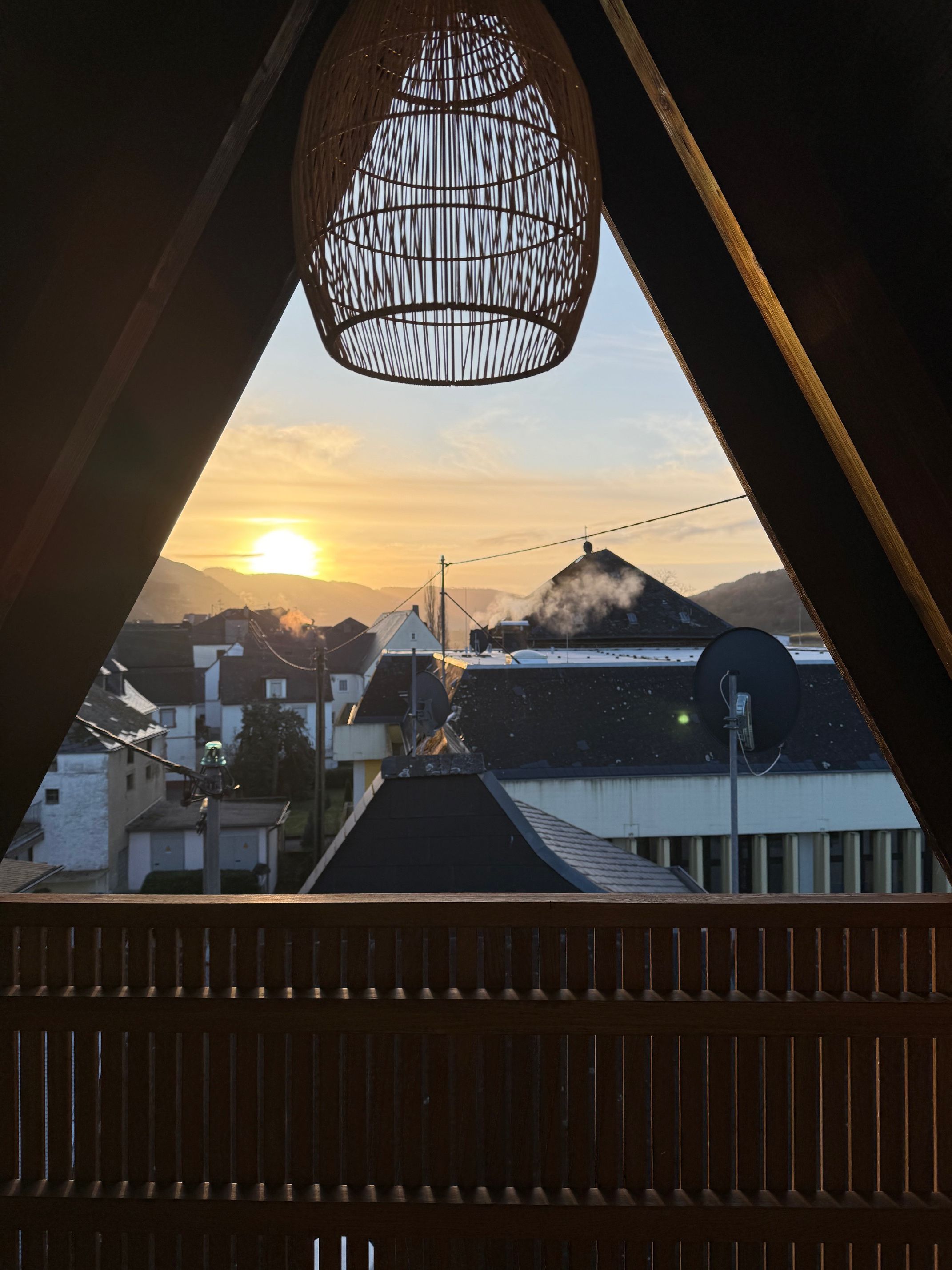Von hier erreicht man über eine schmale, steile Raumspartreppe das Dachgeschoss mit dem dritten Schlafzimmer und einem weiteren Balkon mit wunderbarer Fernsicht über Zeltingen, die Mosel und die Weinberge.