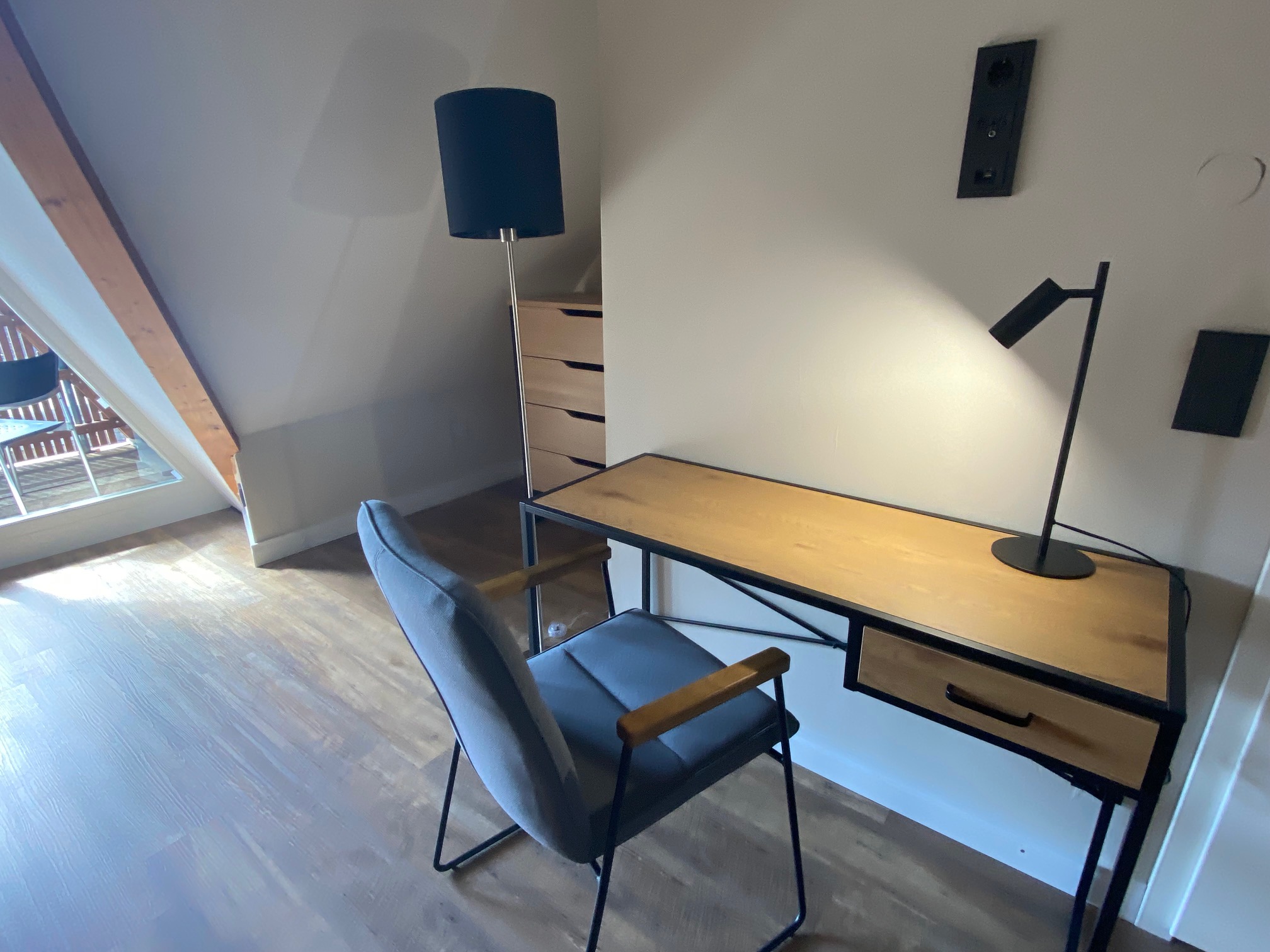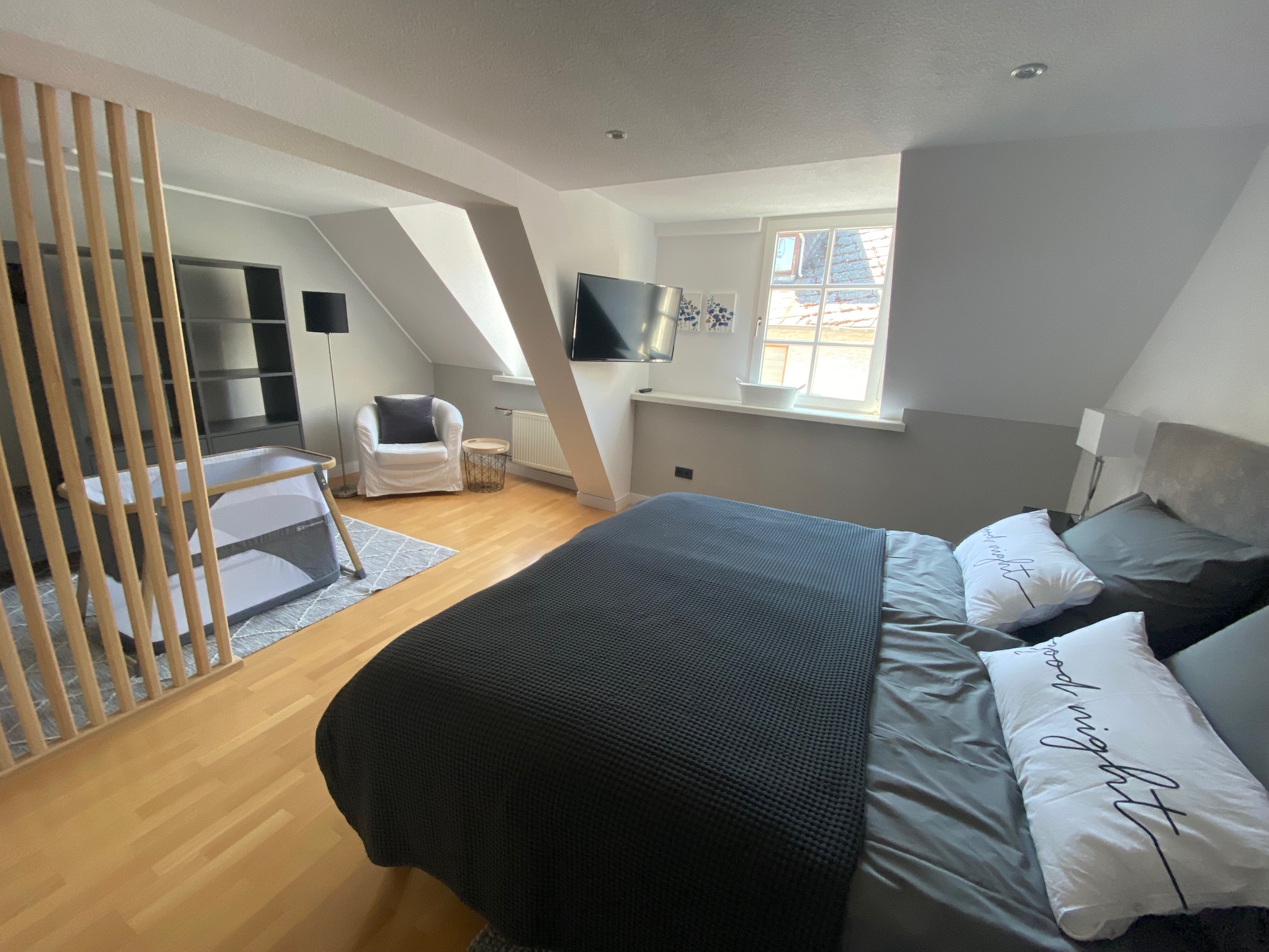 - großes Schlafzimmer mit Boxspringbett 180 x 200 m, Sitzecke und 40′′-Fernseher